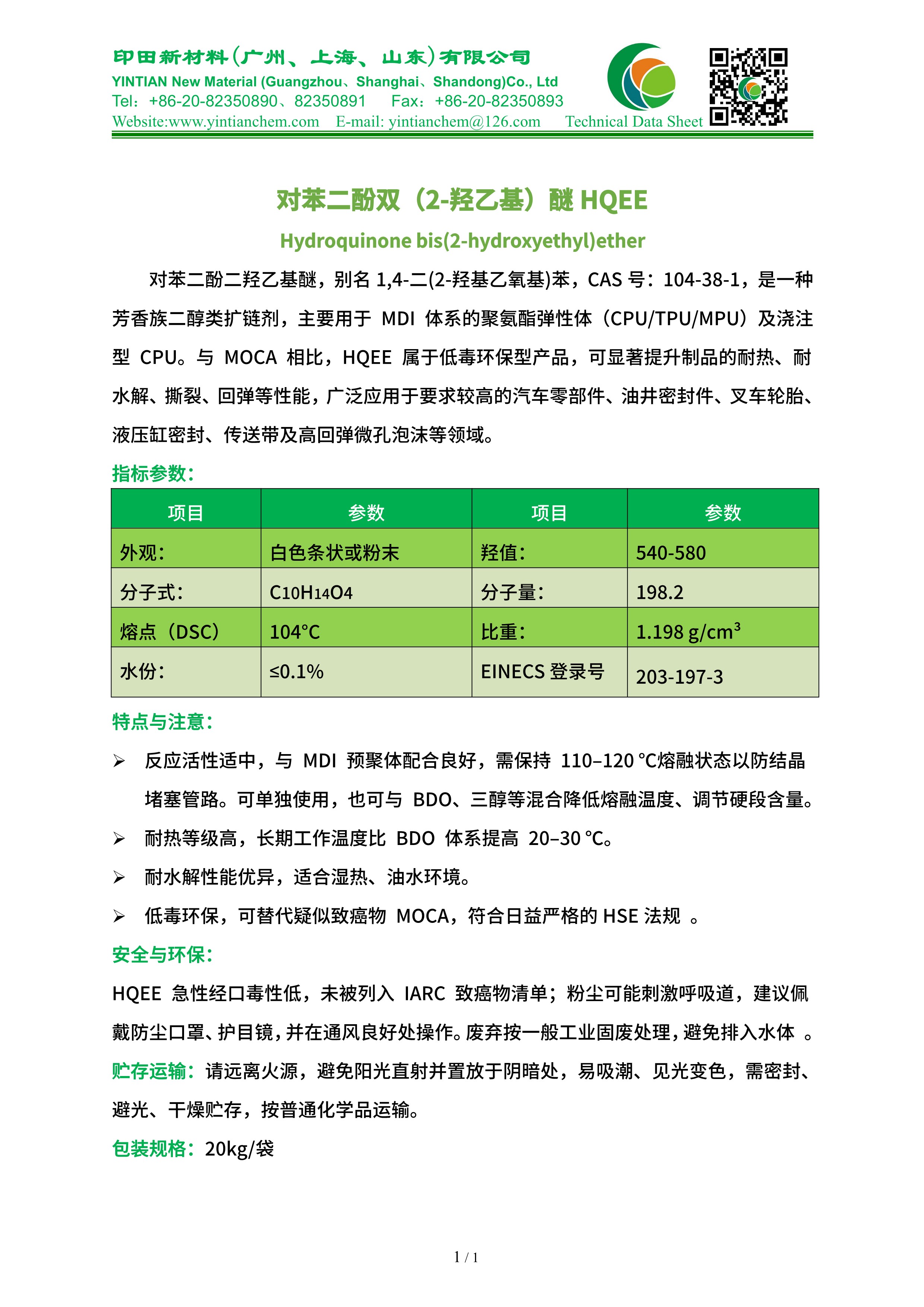 对苯二酚二羟乙基醚,别名 1,4-二(2-羟基乙氧基)苯,CAS 号:104-38-1,是一种芳香族二醇类扩链剂,主要用于 MDI 体系的聚氨酯弹性体(CPU/TPU/MPU)及浇注型 CPU。